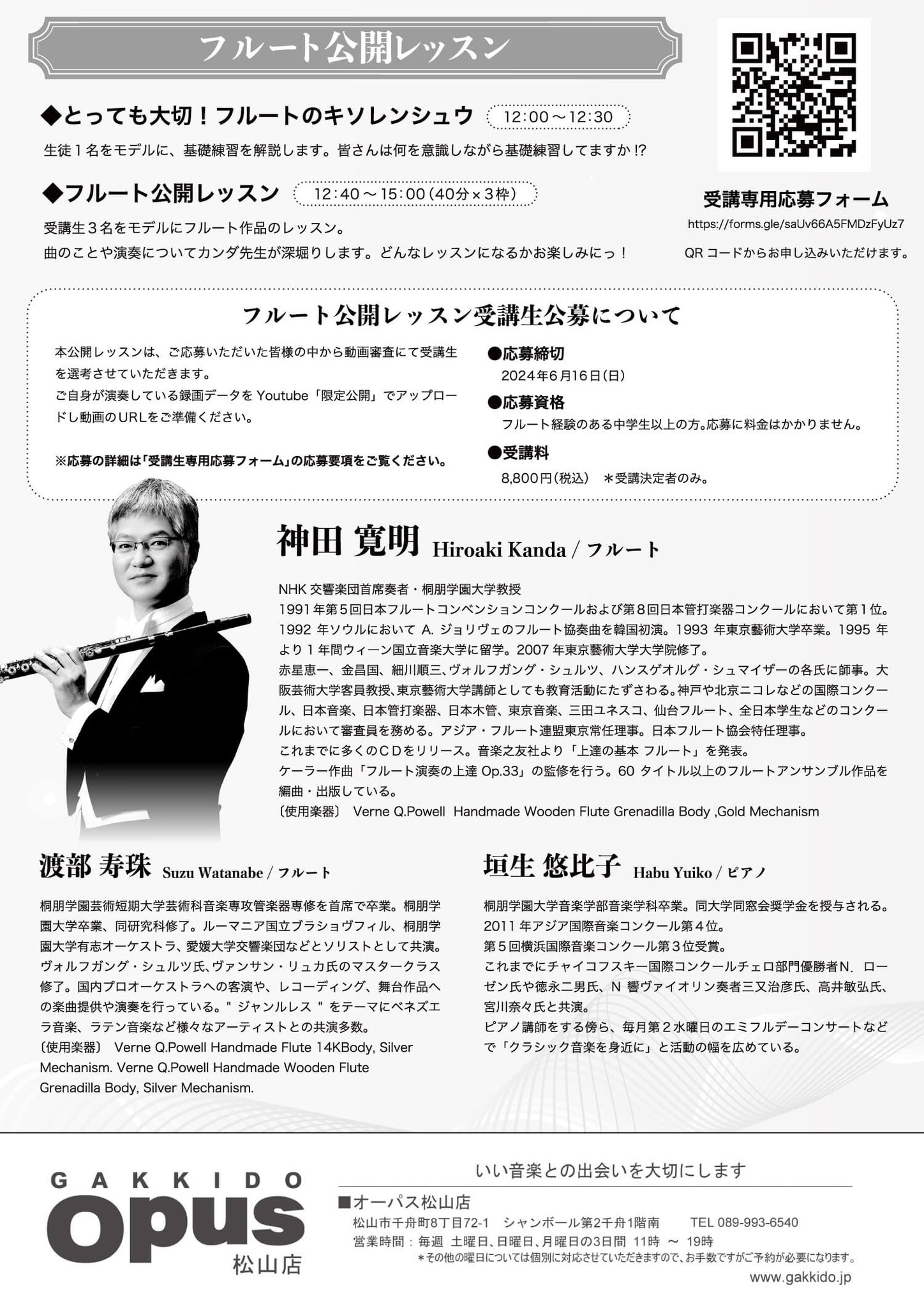 NHK交響楽団首席奏者・桐朋学園大学教授 神田寛明先生による、フルート公開レッスン&コンサートのフライヤーを制作させていただきました。
